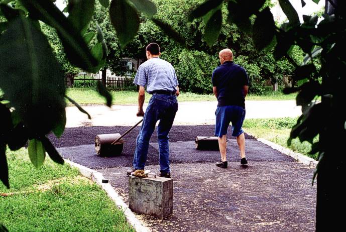 Wir haben im Urlaub tatsächlich mal was Produktives getan. Hier walzen wir gerade den Asphalt an der Auffahrt zu Ludmillas Haus.