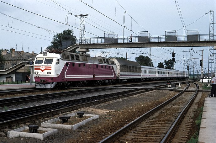 Der Stolizny-Express Dnepropetrovsk - Kiev rast durch Verchnedneprovsk. Als Besonderheit führt dieser Zug einen Autotransportwagen mit.
