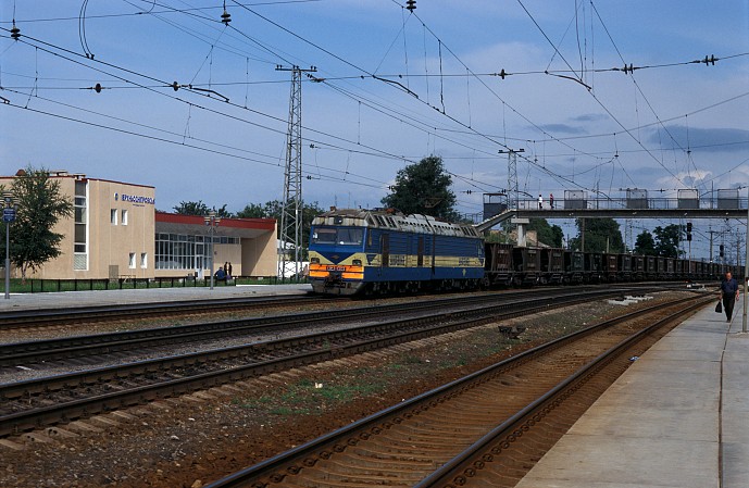 DE1-013 passiert mit ihrem langen Güterzug den Bahnhof von Verchnedneprovsk, welcher nach der Sanierung kaum wieder zu erkennen ist.