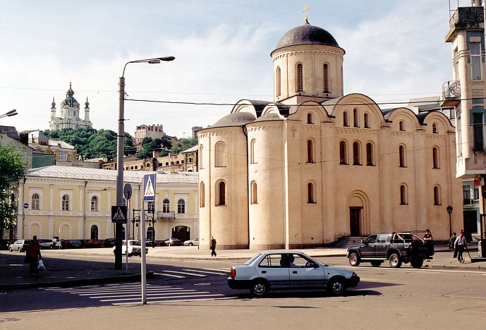 Die Maria-Entschlafens-Kirche in Kiew, im Hintergrund die Andreaskirche.