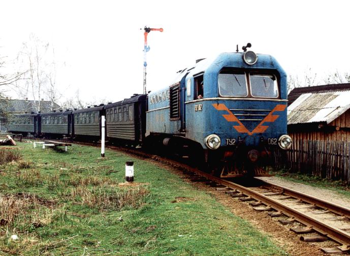 Der planmäßige Personenzug der Strecke Antonowka - Saretschnoje verläßt den Bahnhof Borowa.