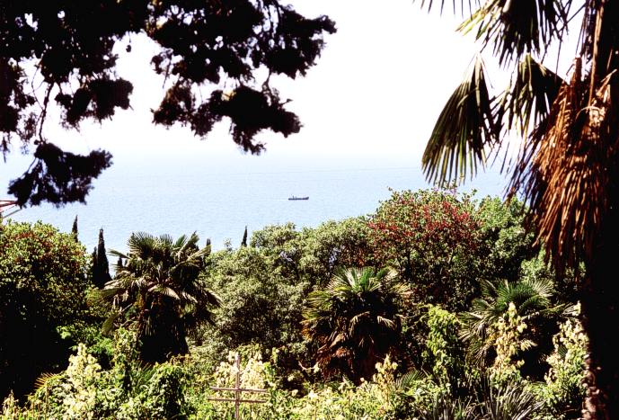 Ein einsamer Frachter dümpelt im Schwarzen Meer vor sich hin. Während unserer Schiffsfahrt nach Jalta machten wir einen Zwischenstopp im Botanischen Garten von Nikita.