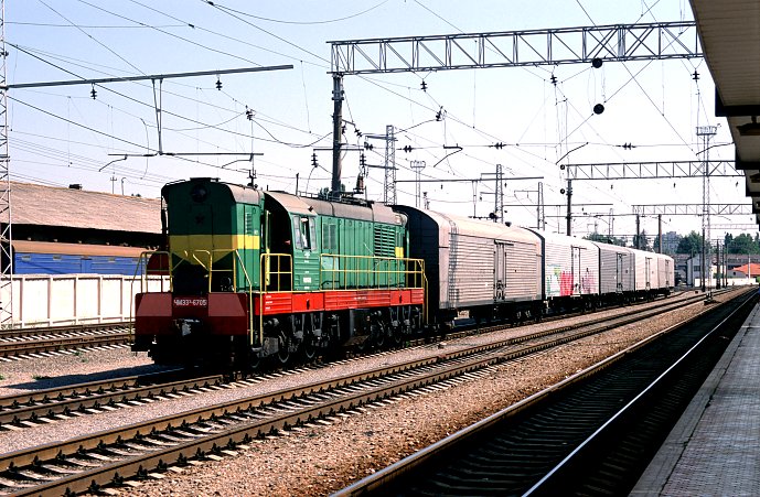 ChME3e-6705 wartet mit ihrem kurzen Güterzug auf Ausfahrt aus dem Bahnhof Simferopol.