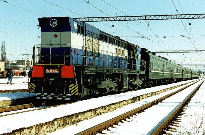 Die riesige Rangierlok ChME5-0003 steht am 19.03.1997 in Jasinowataja vor unserem Zug. Die Zukunft dieser Baureihe sieht wohl nicht sehr rosig aus, da es sich um eine Splittergattung handelt.