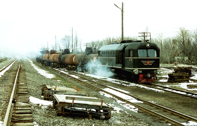 Dieser Schmalspurgüterzug begegnete uns in Josipowka am 22.03.1997. Laut Beschriftung der Kesselwagen beförderte der Zug Benzin.