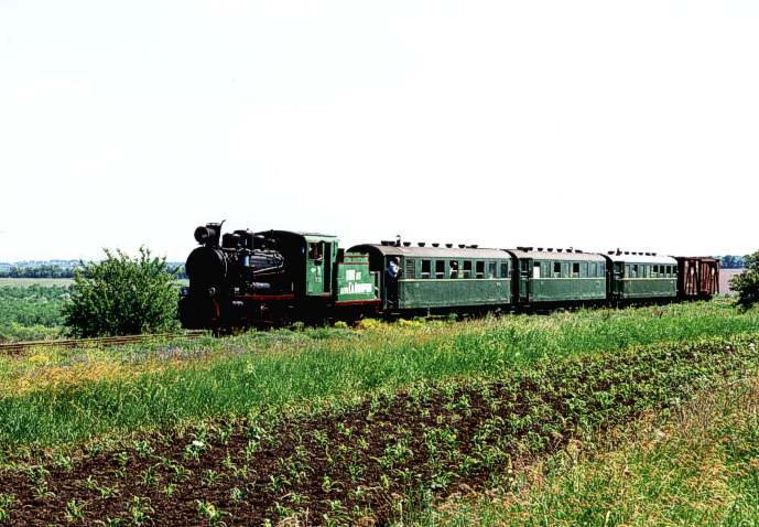 Am 6. Juni 1999 zog die kleine GR-280 unseren Schmalspursonderzug von Podgorodnaja nach Osipowka. Der Tender trägt die Aufschrift: 100 Jahre Depot Gaiworon.